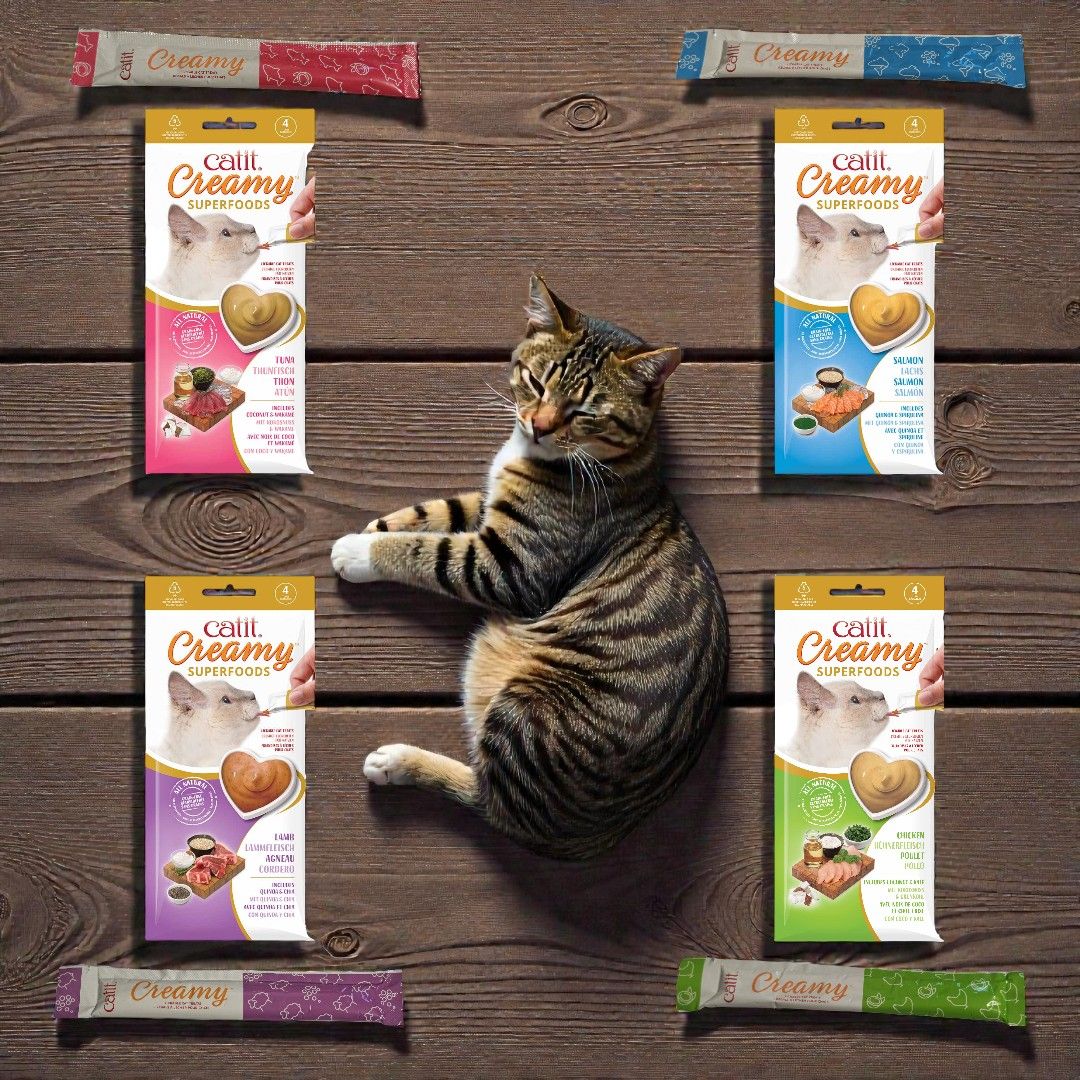 🐾 Catit Creamy Superfoods : friandises à lécher naturelles, enrichies en super aliments et faibles en calories. Délicieuses seules ou en topping. Plusieurs saveurs : agneau, poulet, thon, saumon. Pack 4 tubes de 10 g.