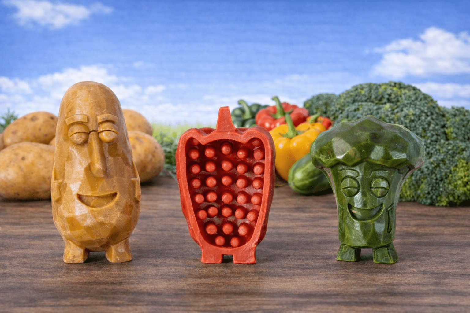Friandises végétariennes Veggie Friends, à base de patate douce (55 %) et de légumes comme le brocoli et le poivron. Sans gluten, digestes, douces pour les dents et enrichies en menthe naturelle pour une haleine fraîche. Disponibles en tailles S et L.