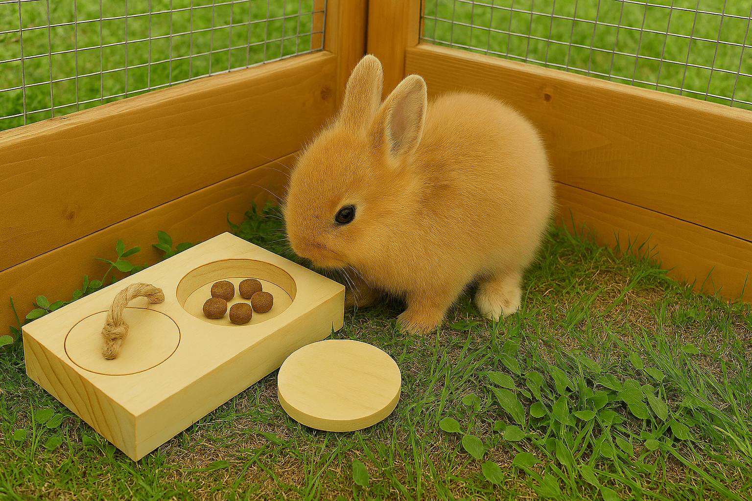Puzzle en bois pour lapins et rongeurs : l’animal tire sur les cordes pour soulever les couvercles et accéder aux friandises. Stimule l’activité mentale et le rongement naturel. Gravure du prénom en option. Dimensions 12 × 6 × 2,5 cm.
