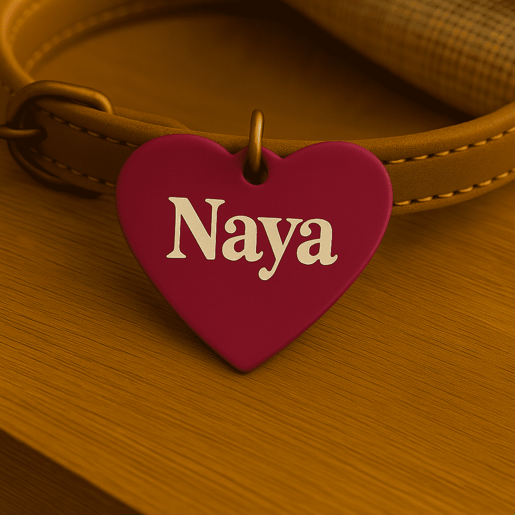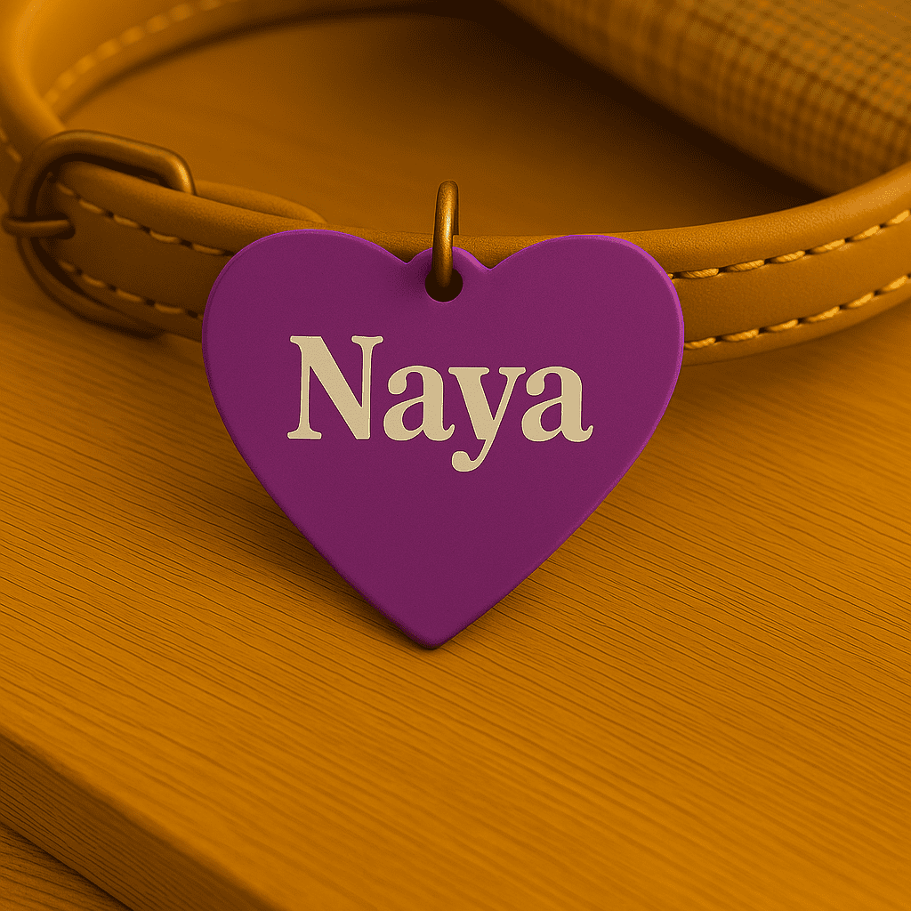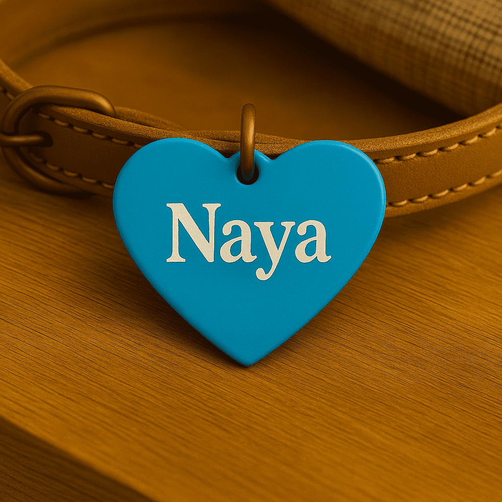 Médaille personnalisée en forme de cœur, en aluminium anodisé léger et durable. Gravure laser du prénom au recto et 1 ou 2 numéros au verso. Plusieurs couleurs et polices au choix. Anneau fourni. Idéale pour identifier votre animal en balade.