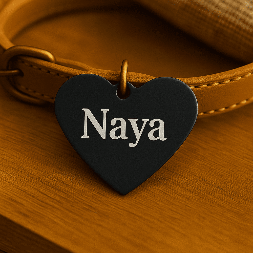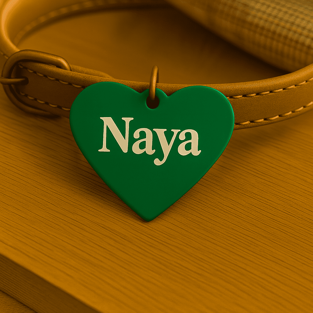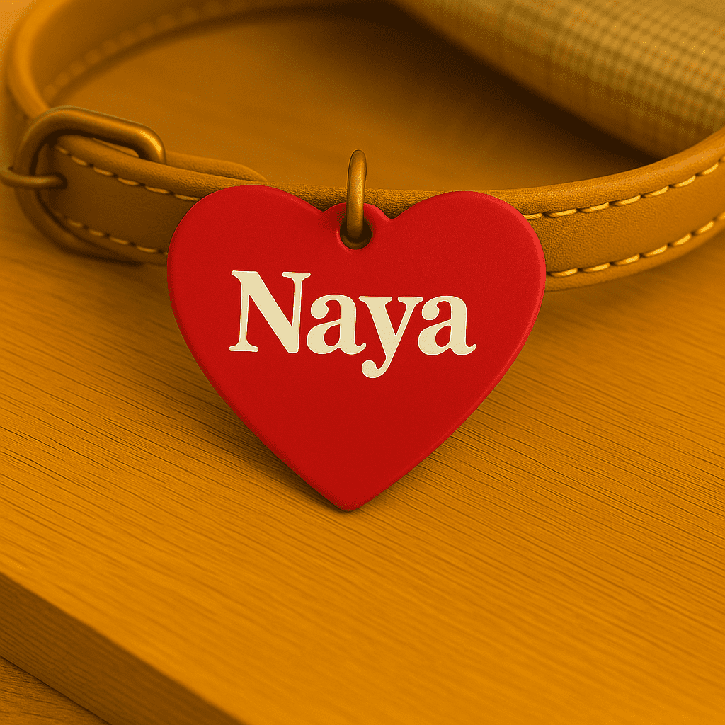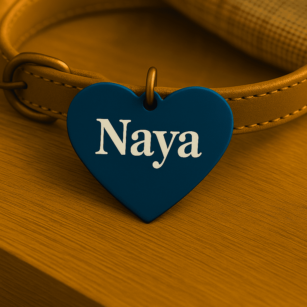 Médaille personnalisée en forme de cœur, en aluminium anodisé léger et durable. Gravure laser du prénom au recto et 1 ou 2 numéros au verso. Plusieurs couleurs et polices au choix. Anneau fourni. Idéale pour identifier votre animal en balade.