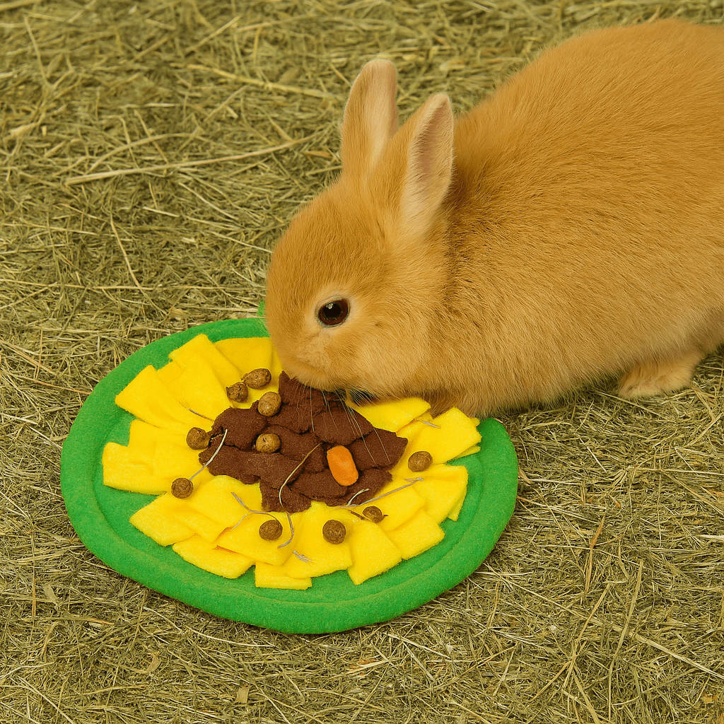 Tapis de fouille en forme de tournesol pour petits animaux : cachez fruits, légumes ou friandises pour stimuler la recherche naturelle de nourriture. Polaire douce, fond antidérapant. Dimensions 24 × 24 × 2,5 cm. Ne pas laisser sans surveillance.